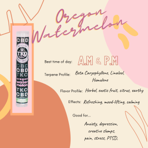 Premium Oregon Watermelon CBD Pre-Rolls. Our signature TKO pre-rolls are made of fresh, ground-up flower - never shake or trim. Never sprayed with pesticides!