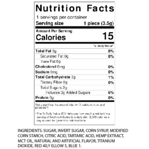Sugar, corn syrup, modified corn starch, citric acid, tartaric acid, hemp extract, MCT oil, natural and artificial flavor, titanium dioxide, coloring.